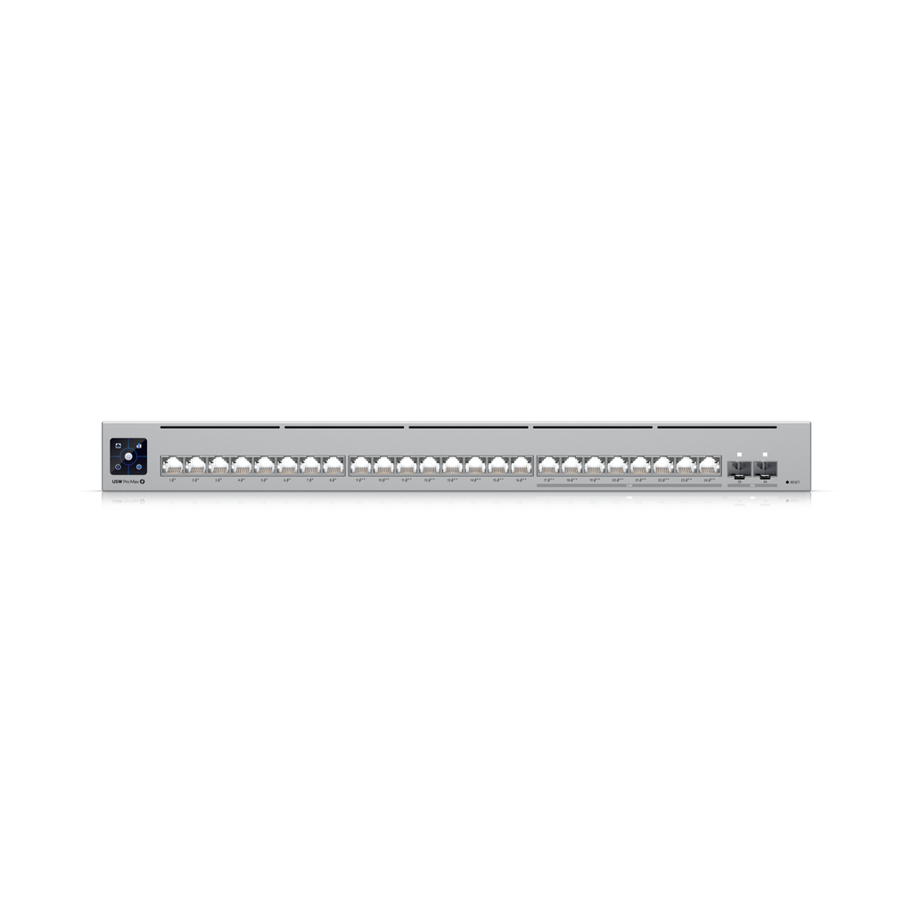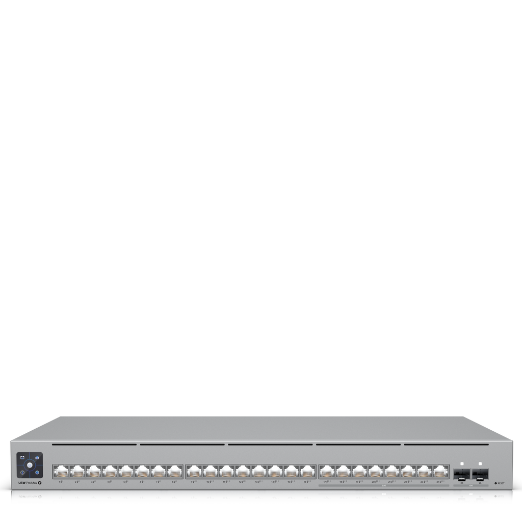 SKU: USW-Pro-Max-24-PoEThe Ubiquiti UniFi USW-Pro-Max-24-PoE is a high-performance Layer 3 managed switch built for modern UniFi deployments requiring multi-gigabit speeds and high-power PoE. It combines 2.5GbE and Gigabit PoE++ ports with 10G SFP+ uplinks, delivering flexible connectivity for WiFi 7 access points, cameras, VoIP systems, and enterprise devices.